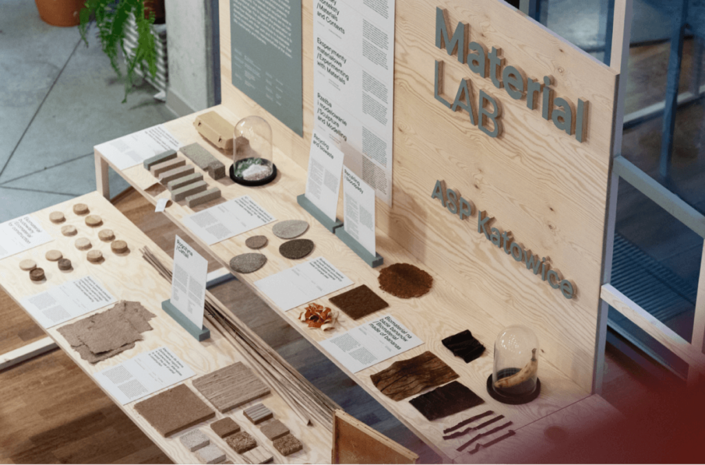 Wystawa Material LAB, jest przeglądem prac studenckich, które powstały na kierunku Wzornictwo ASP w Katowicach w Pracowni Projektowania Produktu oraz na przedmiotach: Materiały i konteksty, Eksperymenty materiałowe, Rzeźba i Modelowanie.